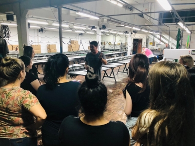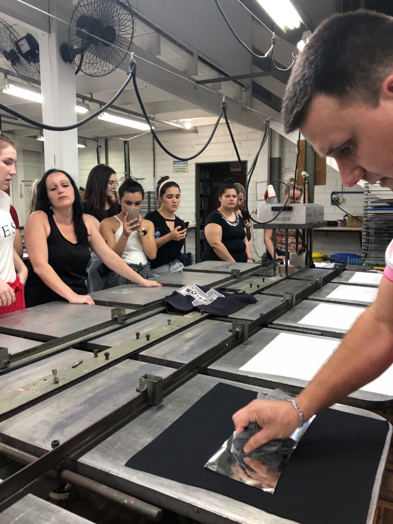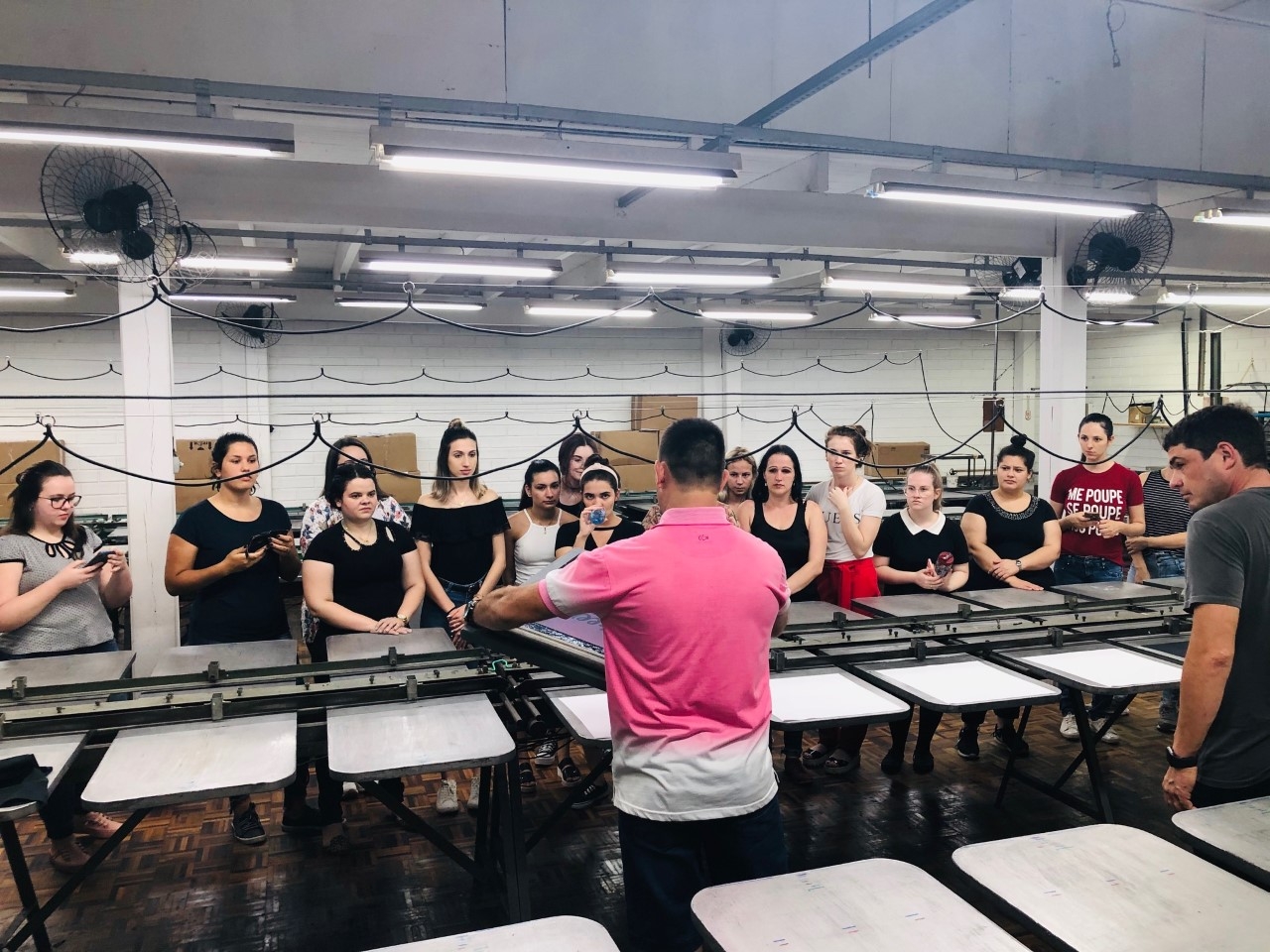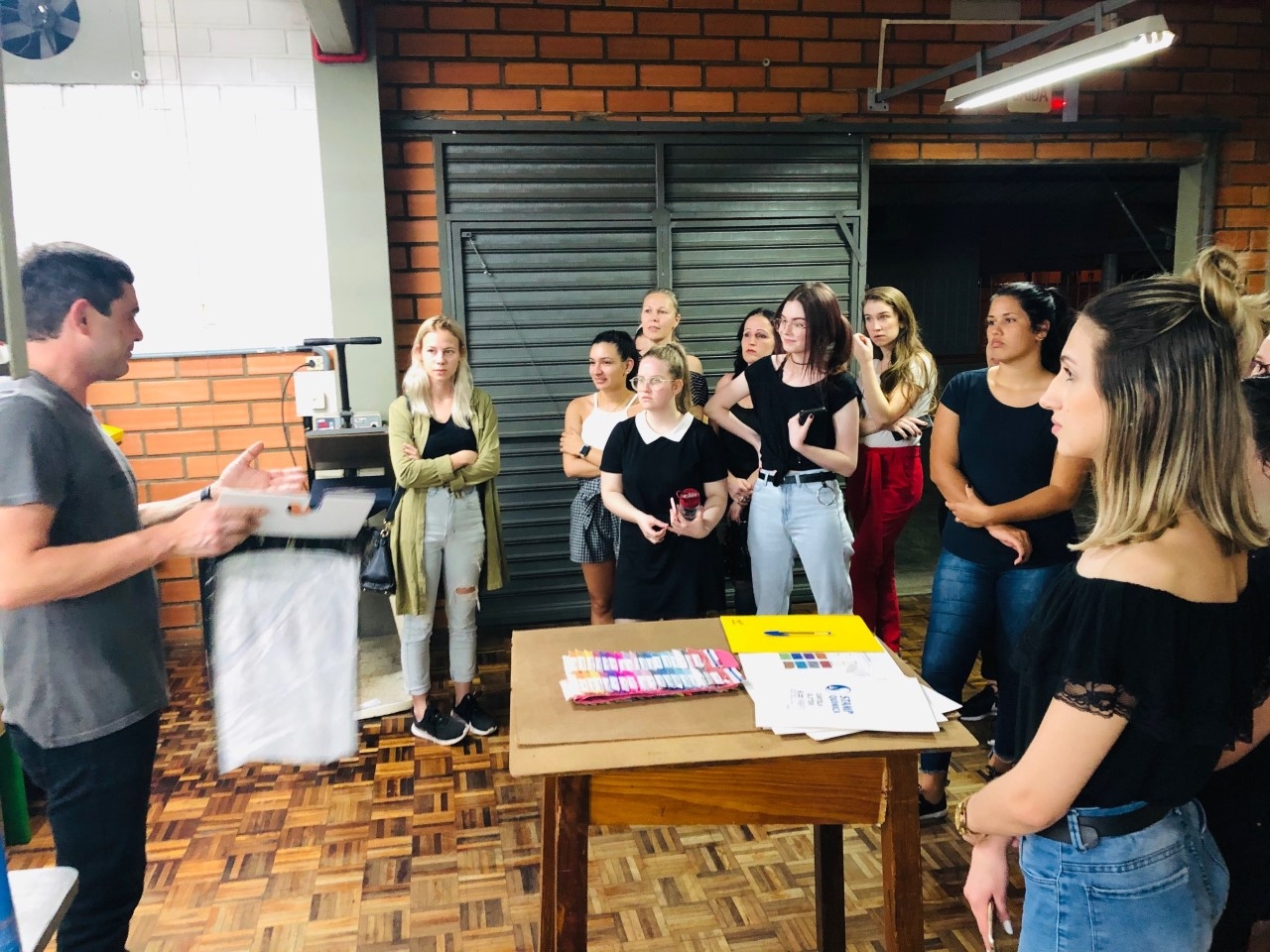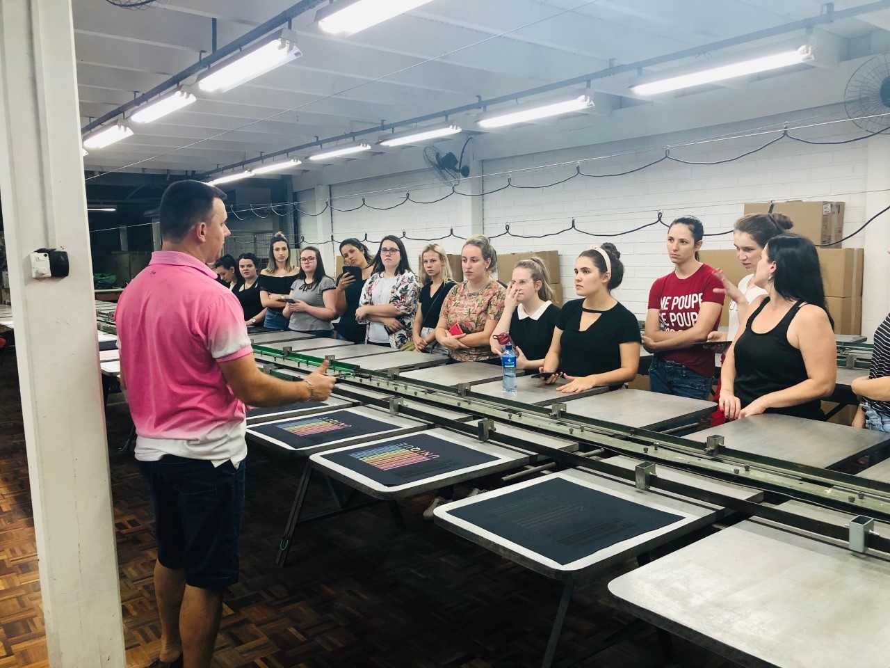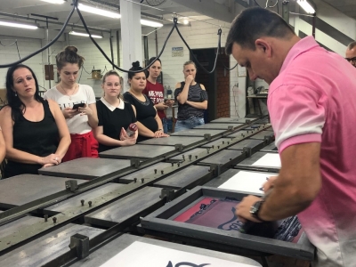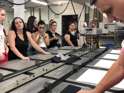 Durante a visita, professora e alunos foram acompanhados pelo proprietário, Sr. Marcio Sodré, que falou sobre a história da empresa, seus clientes e quais são os produtos e técnicas de estampa que mais elaboram. Após a explanação inicial, os acadêmicos puderam observar como as estampas são feitas, com explicação detalhada sobre a importância da escolha correta do tecido base e a forma que o quadro de estamparia deve ter, além da tinta a ser utilizada. Para a demonstração das técnicas, a empresa disponibilizou três funcionários que estiveram presentes durante toda a visita.