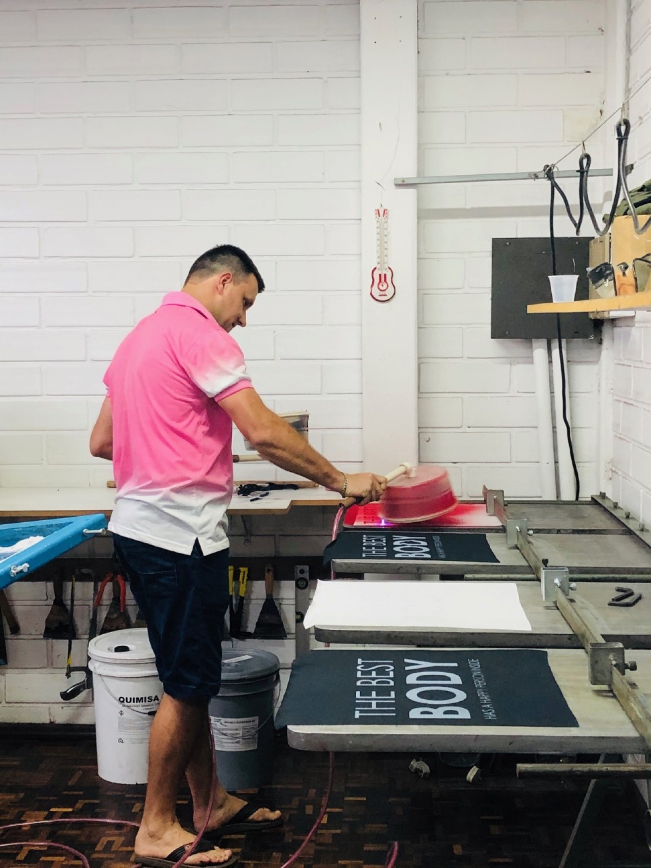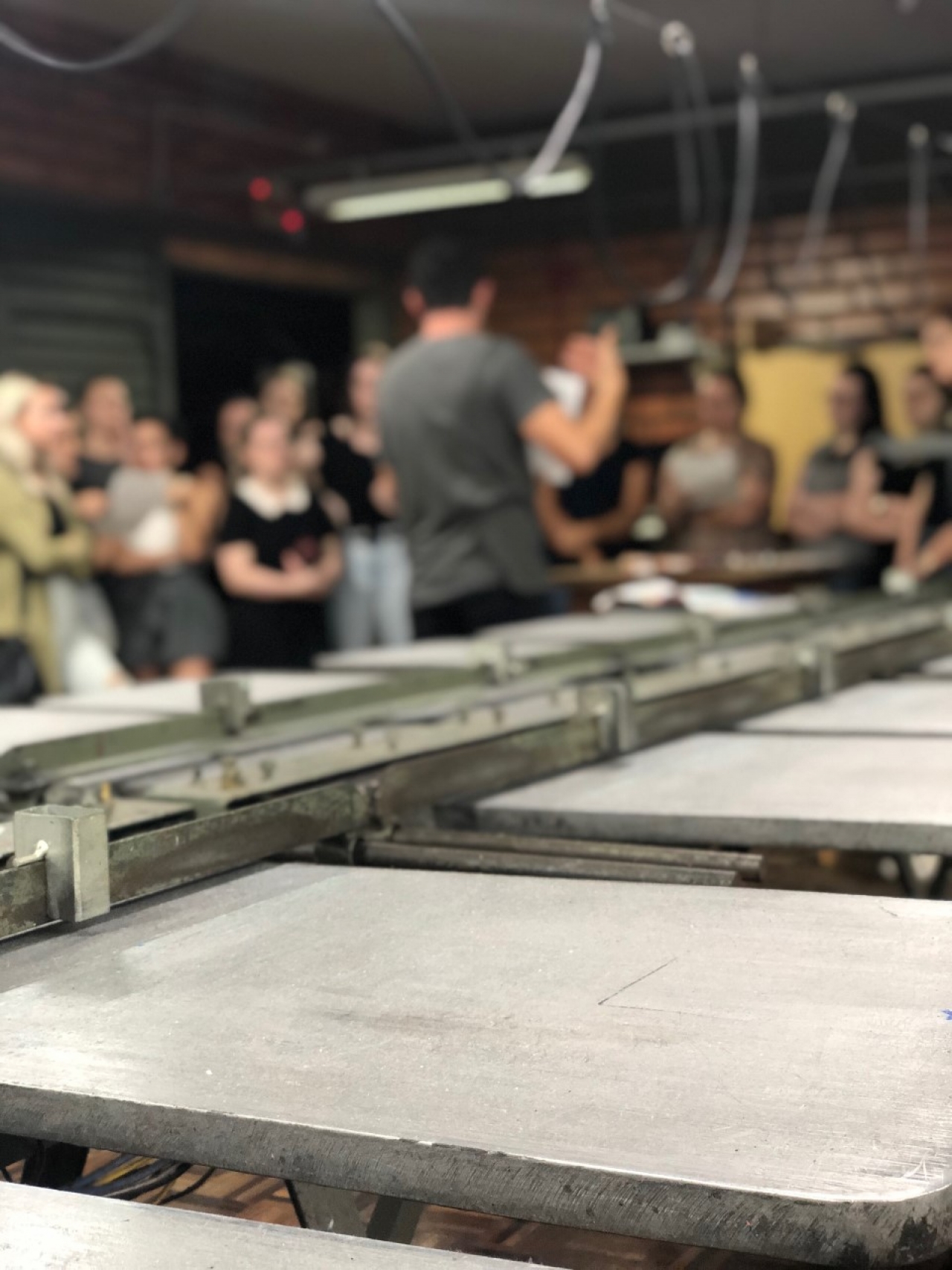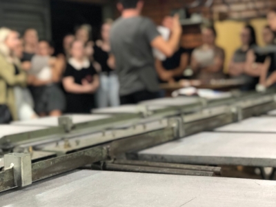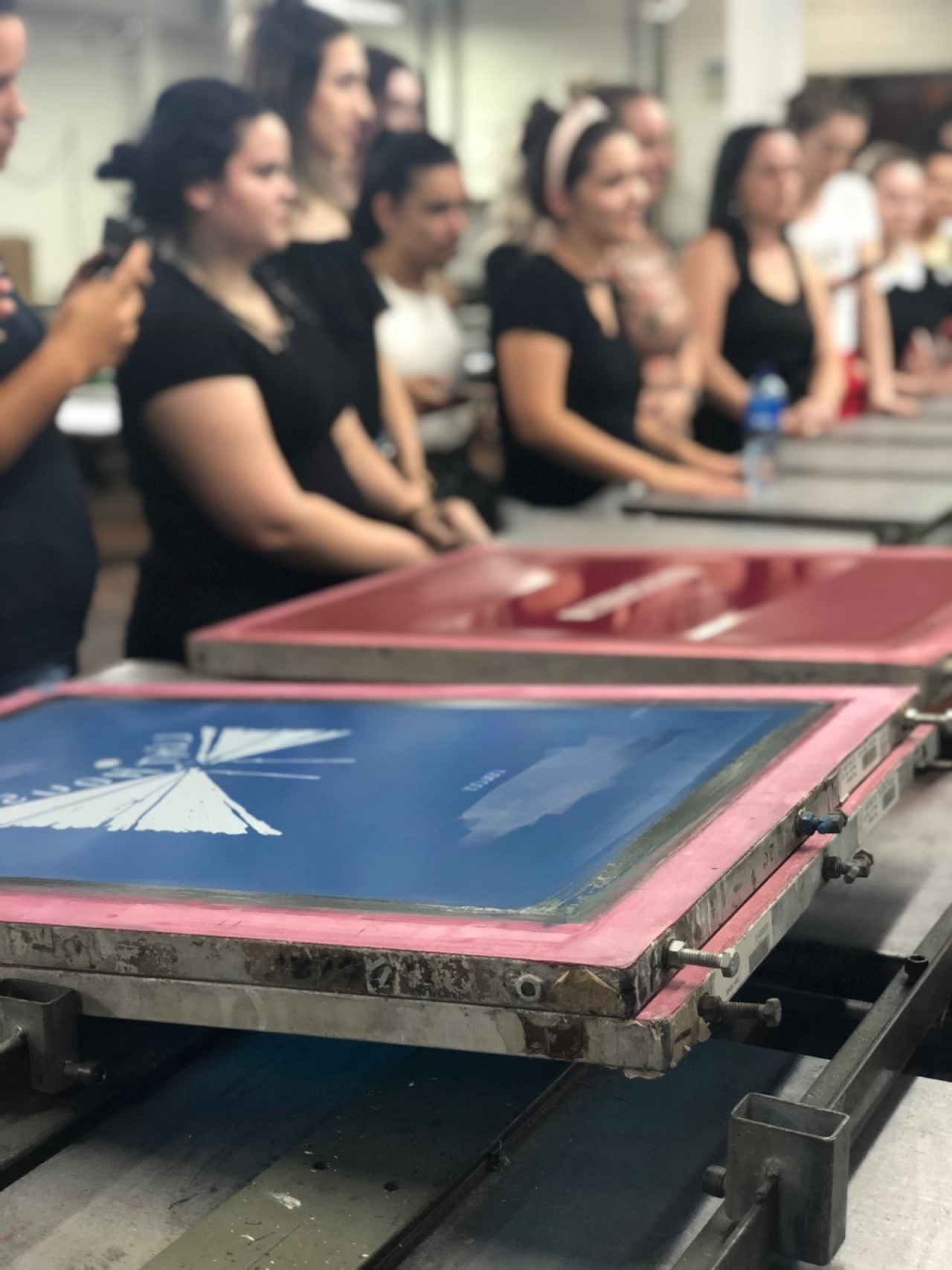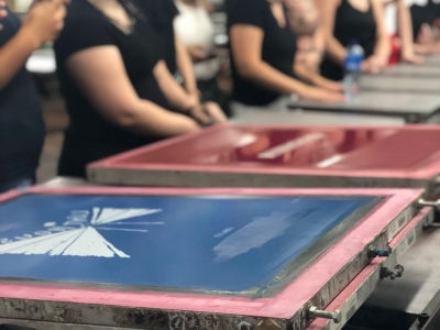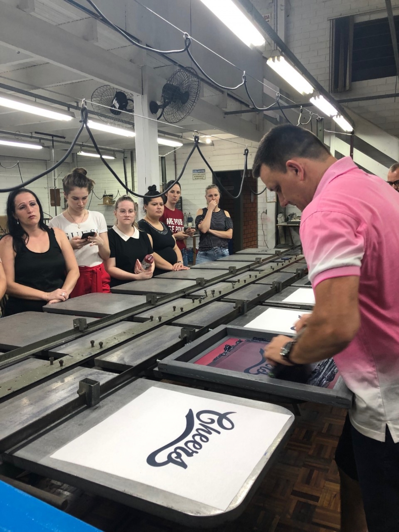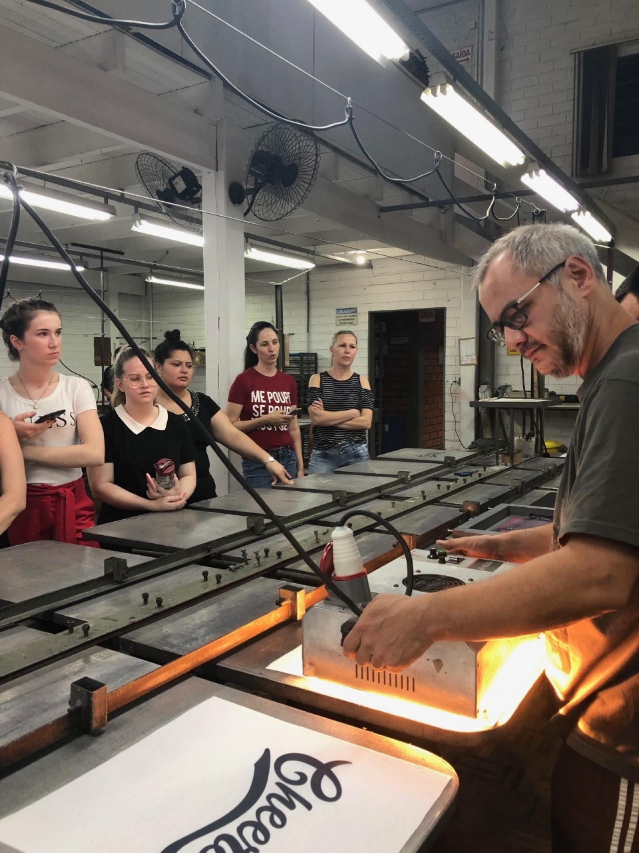 Durante a visita, professora e alunos foram acompanhados pelo proprietário, Sr. Marcio Sodré, que falou sobre a história da empresa, seus clientes e quais são os produtos e técnicas de estampa que mais elaboram. Após a explanação inicial, os acadêmicos puderam observar como as estampas são feitas, com explicação detalhada sobre a importância da escolha correta do tecido base e a forma que o quadro de estamparia deve ter, além da tinta a ser utilizada. Para a demonstração das técnicas, a empresa disponibilizou três funcionários que estiveram presentes durante toda a visita.