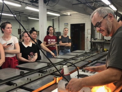 Os acadêmicos foram acompanhados pela professora e coordenadora do curso, Caroline Hadlich, que leciona aos alunos a disciplina de Projeto de Design e desenvolve um projeto que tem como temática algumas técnicas de estampas: Flocado, Foil, 3D, Glitter, Corrosão e Cromia.