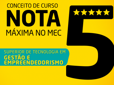 Os pontos essenciais avaliados correspondem a três dimensões: Organização Didático-Pedagógica, Corpo Docente e Infraestrutura. A avaliação do curso superior de Tecnologia em Gestão e Empreendedorismo obteve Conceito de Curso igual a 5, isto é, nota máxima em uma escala que abrange cinco níveis de qualidade (de 1 a 5).