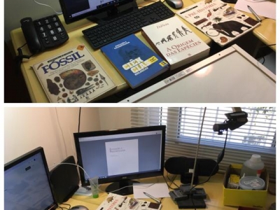 Neste período no qual estamos realizando encontros virtuais por meio da ferramenta TEAMS, após o estudo e seleção dos materiais, organizo o espaço (escritório), no qual, disponibilizo duas telas de computador e duas webcams. Esta estrutura, permite agilidade e interação entre os recursos didático pedagógicos a serem utilizados durante o encontro virtual.
