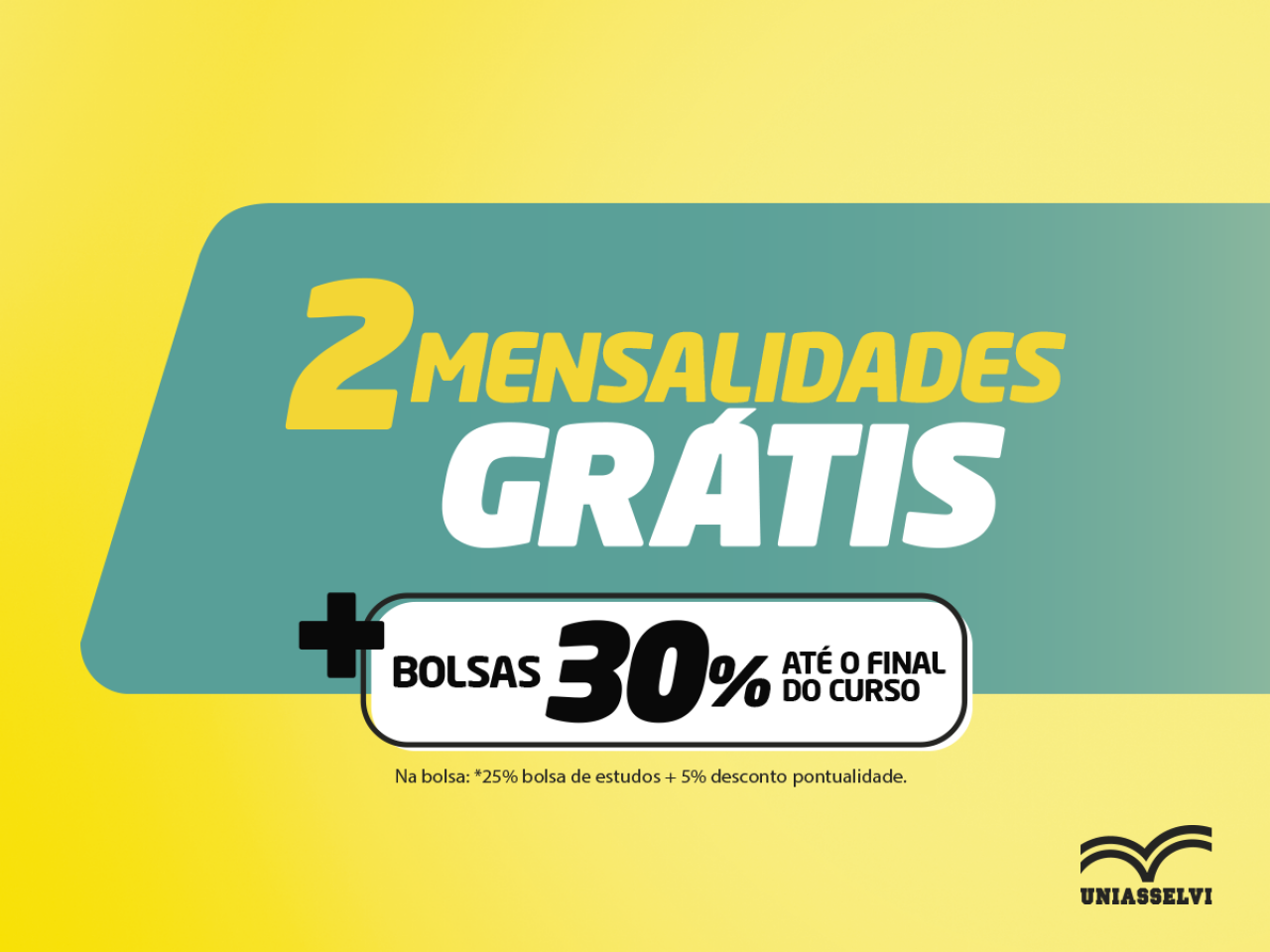 A UNIASSELVI está com condições especiais para quem efetuar a matrícula ou transferência em cursos de graduação EAD em mais de 450 polos (consulte aqui). No dia de hoje, 9 de setembro de 2019, o candidato terá à disposição a oferta de 2 mensalidades grátis + 30% de bolsa de estudos* até o fim do curso (*25% de bolsa + 5% de desconto pontualidade). Para receber o benefício, o candidato deve realizar a inscrição através do site uniasselvi.com.br e ir até o polo para efetivar a matrícula.