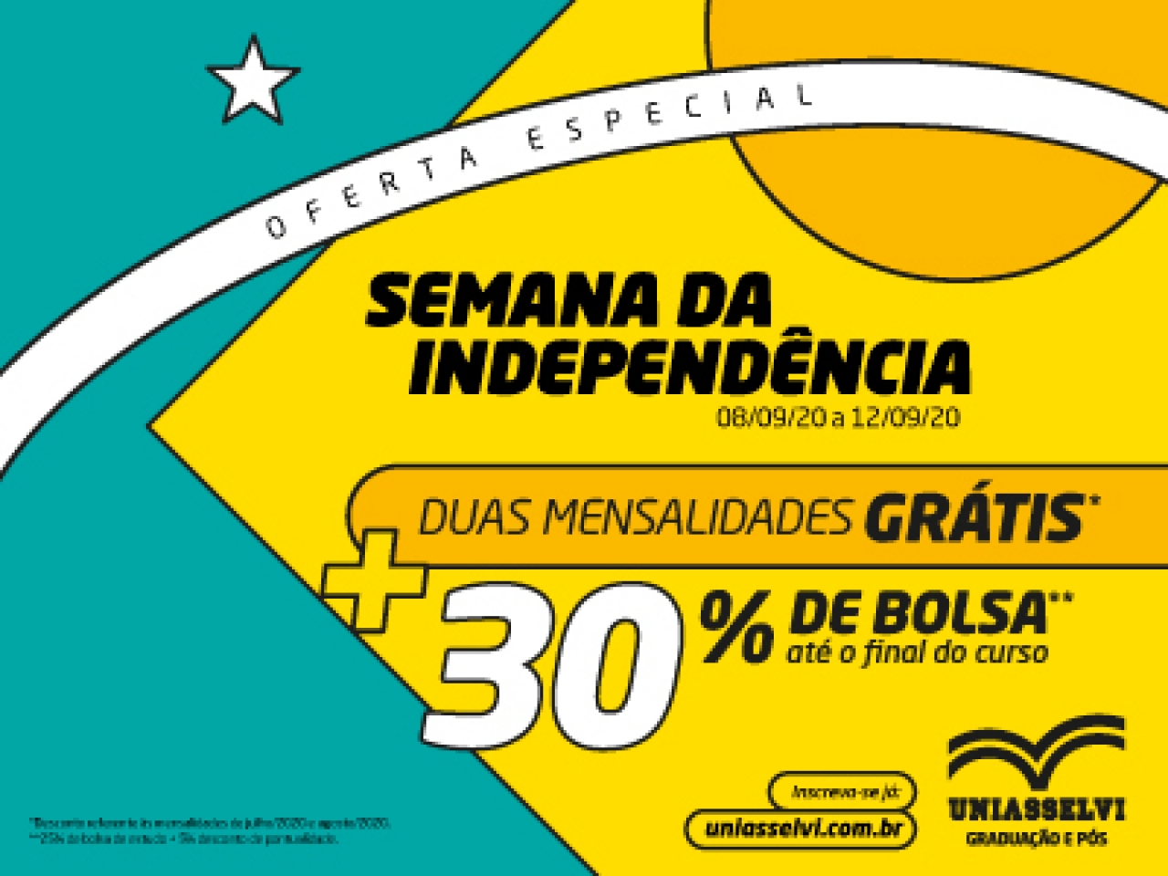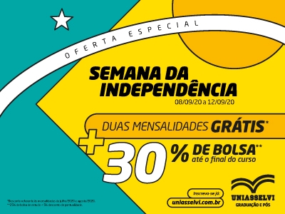 Serviço: Semana da Independência UNIASSELVI, de 8 a 12 de setembro. Matrículas grátis e bolsas de estudo a partir de 30%. Inscrições clicando aqui.