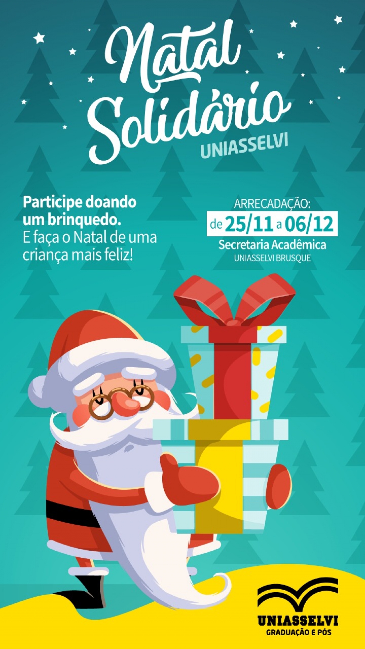 Com o objetivo de promover a integração de todos os colaboradores, acadêmicos e comunidade externa e estimular a cidadania por meio de ações sociais, através da responsabilidade social, a UNIASSELVI promove nos meses de novembro e dezembro o 1º Natal Solidário UNIASSELVI Brusque.