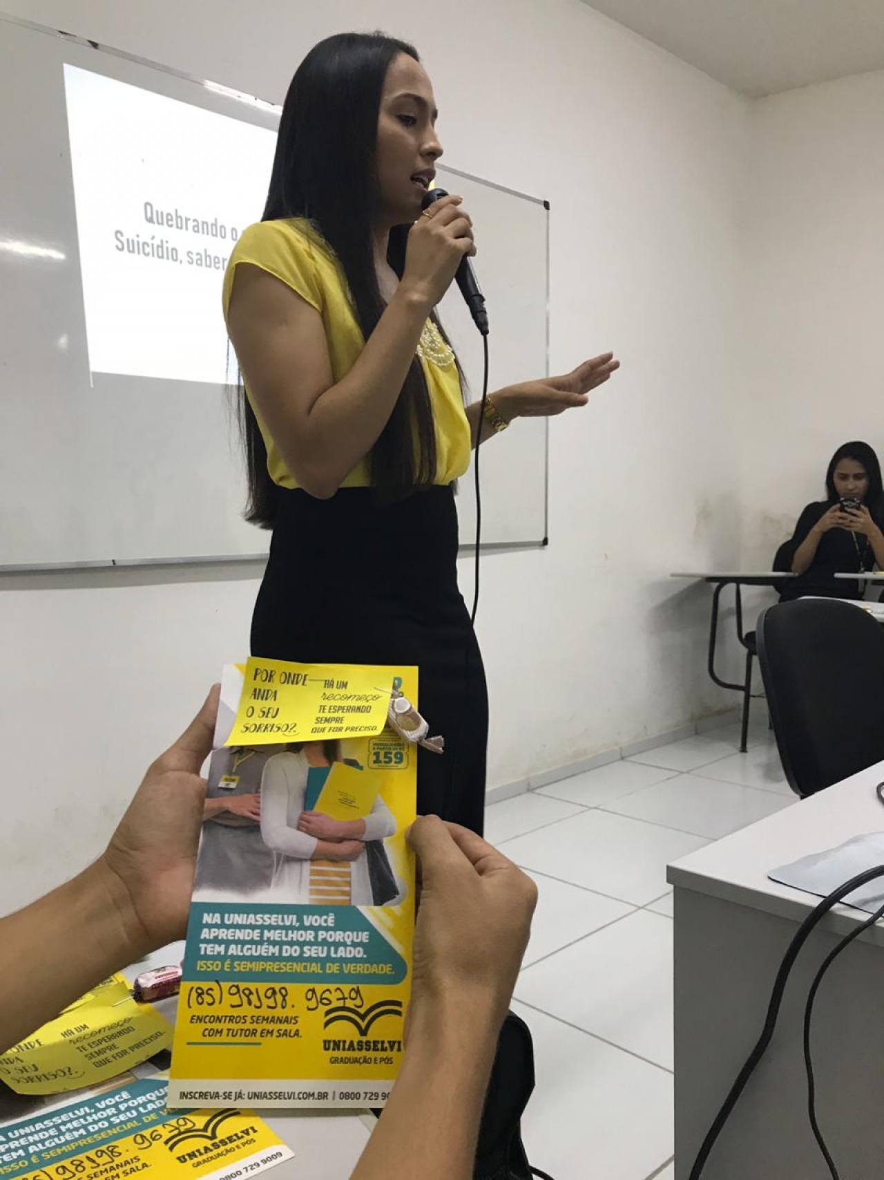 Na última sexta-feira, 20 de setembro, a UNIASSELVI Itapajé promoveu uma palestra com o tema "Quebrando o Silêncio: Suicídio, conhecer para intervir", proferida pela psicóloga Aline Rodrigues – atuação em psicologia clínica e na área da psicologia social. Diversas turmas participaram do evento.