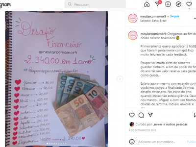 Em janeiro de 2021, a influenciadora digital do perfil @meularcomamor9, no Instagram, Isabela Souza, 25 anos, lançou o Desafio Financeiro. Em um ano ela e parte dos mais de 130 mil seguidores conseguiram economizar. No décimo segundo mês, Bella, como é conhecida, juntou R$ 2.340.