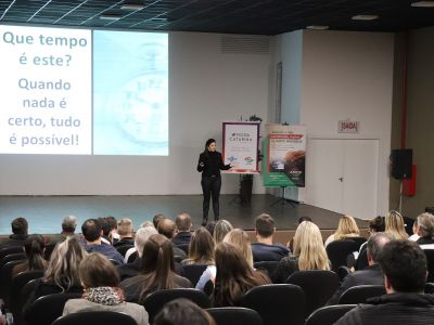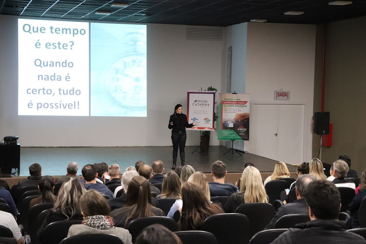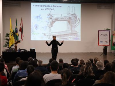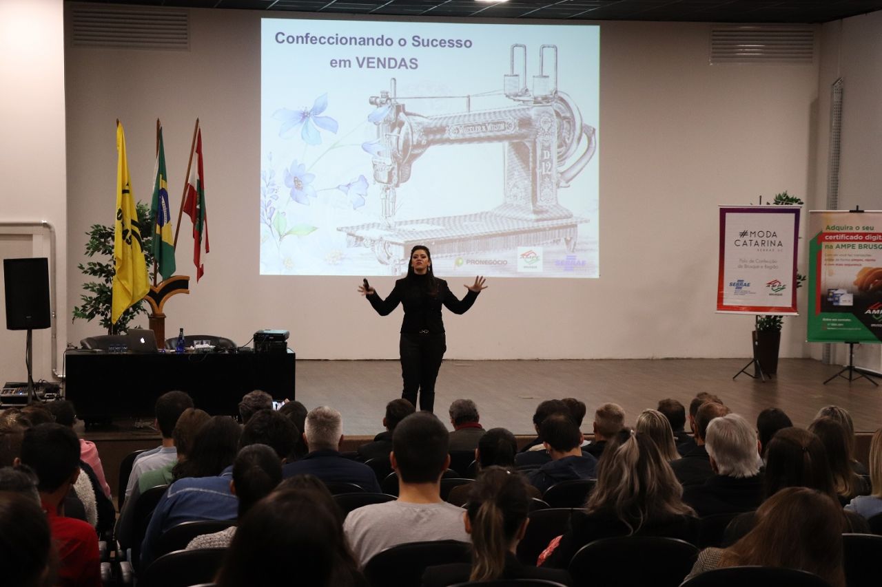 Cerca de 150 participantes estiveram no auditório da Uniasselvi Brusque para acompanhar a palestra ‘Confeccionando o Sucesso em Vendas’, que teve o objetivo de oportunizar um treinamento aos associados da AmpeBr que estarão comercializando seus produtos, durante a 46ª Pronegócio Alto Verão, a ser realizada de 6 a 10 de agosto, na Sociedade Santos Dumont.