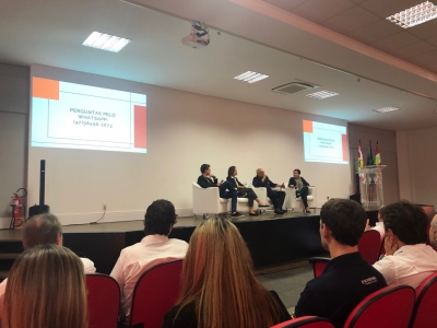 O painel foi mediado por Cristiane Iata, Executiva de Contas do Governo – FIESC, Engenheira Eletricista e Mestre em Engenharia Mecânica. É Especialista em gerenciamento de projetos com certificação internacional PMI e MBA em Gestão. Atuou na iniciativa privada com engenheira de automação, como consultora de gestão, como gerente de planejamento e inteligência e como gerente de operações. Atualmente, responde pela articulação com o governo, dentro da diretoria de inovação da Federação das Indústrias de Santa Catarina.