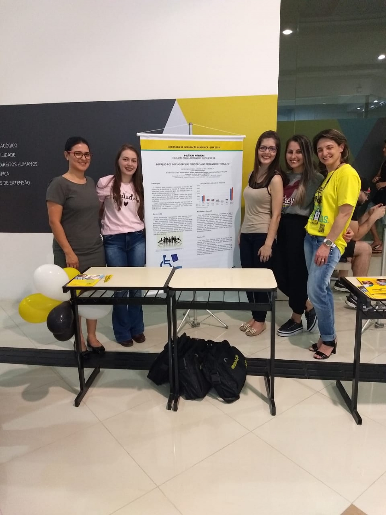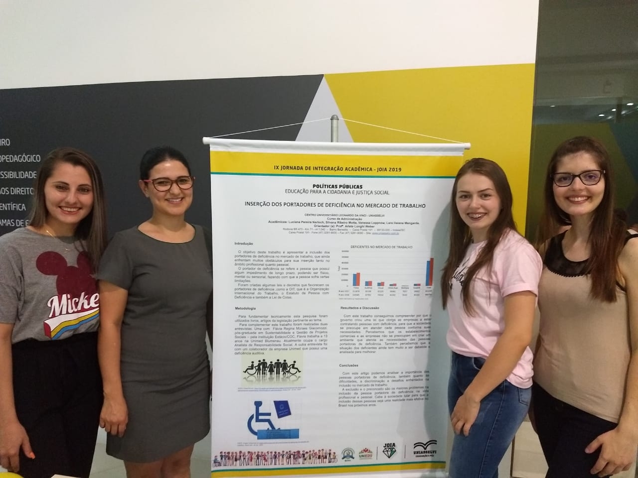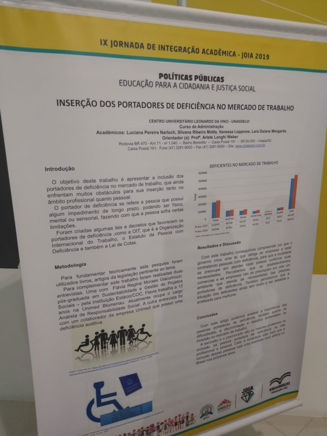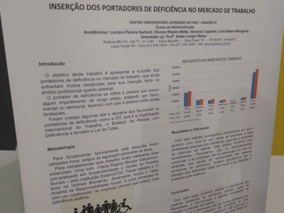→ Inserção dos portadores de deficiência no mercado de trabalho, que trouxe uma análise das leis que propiciam a inserção deste grupo de trabalhadores no mercado laboral, bem como uma entrevista com gestor de RH e portadores de deficiência que se encontram atuando. As leis contribuem para alocação dos portadores de deficiência junto às empresas, mas, as dificuldades de adaptação, preconceito e discriminação ainda perduram no mercado. O trabalho foi socializado pelos acadêmicos Lara Daiane Mengarda, Luciana Pereira Narloch, Silvana Ribeiro Motta e Vanessa Loppnow.