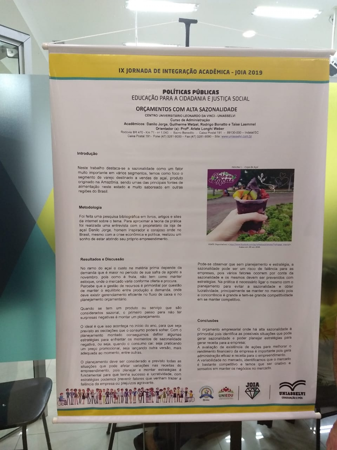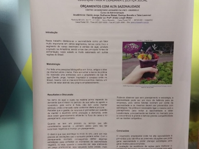 → Orçamentos com alta sazonalidade, que buscou trazer a prática do planejamento orçamentário a partir de um estudo de caso em uma loja de açaí, um ramo com forte influência sazonal, onde o empreendedor deve articular um bom planejamento e estratégias inovadoras para superar as épocas de baixa venda do açaí. O trabalho foi socializado pelos acadêmicos Danilo Jorge, Guilherme Wetzel e Taíse Laemmel.