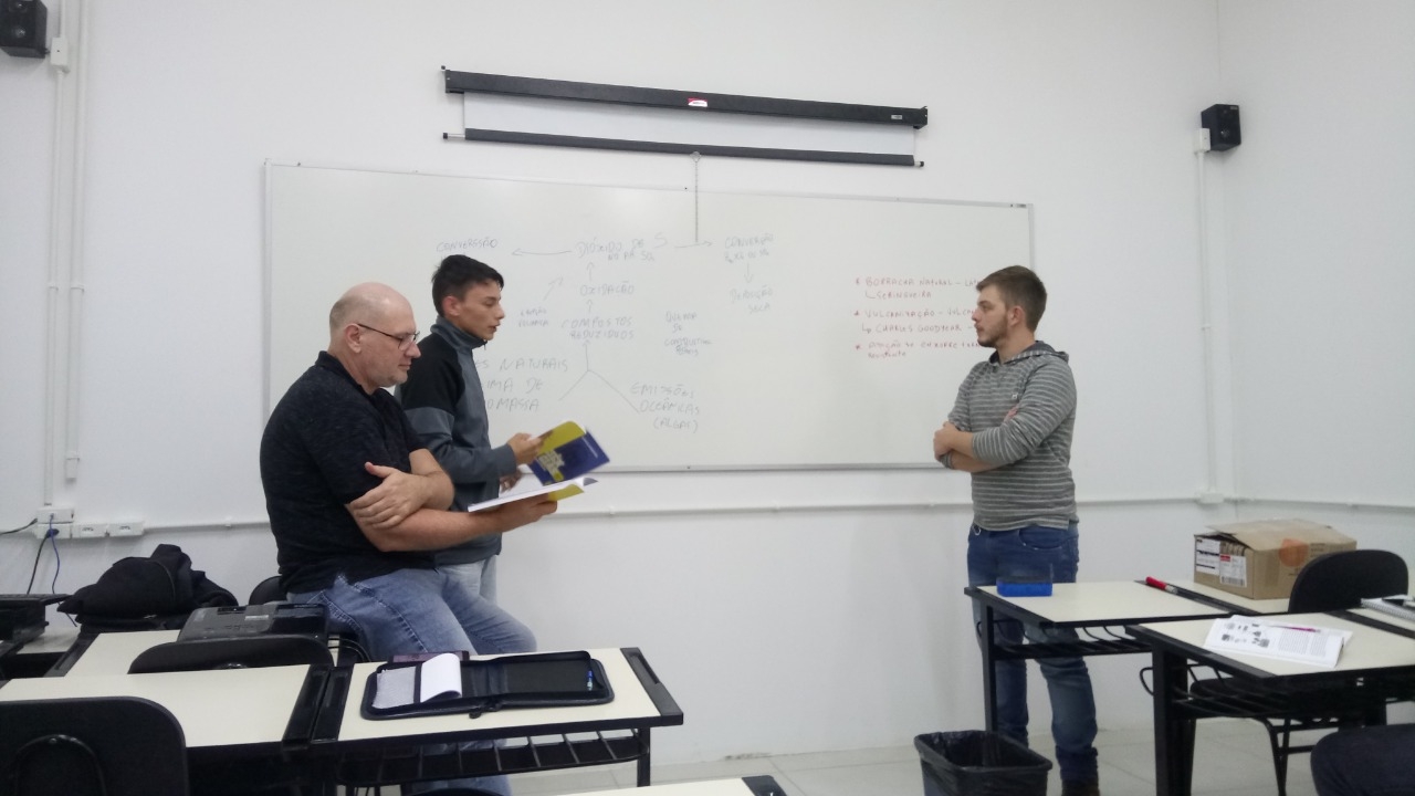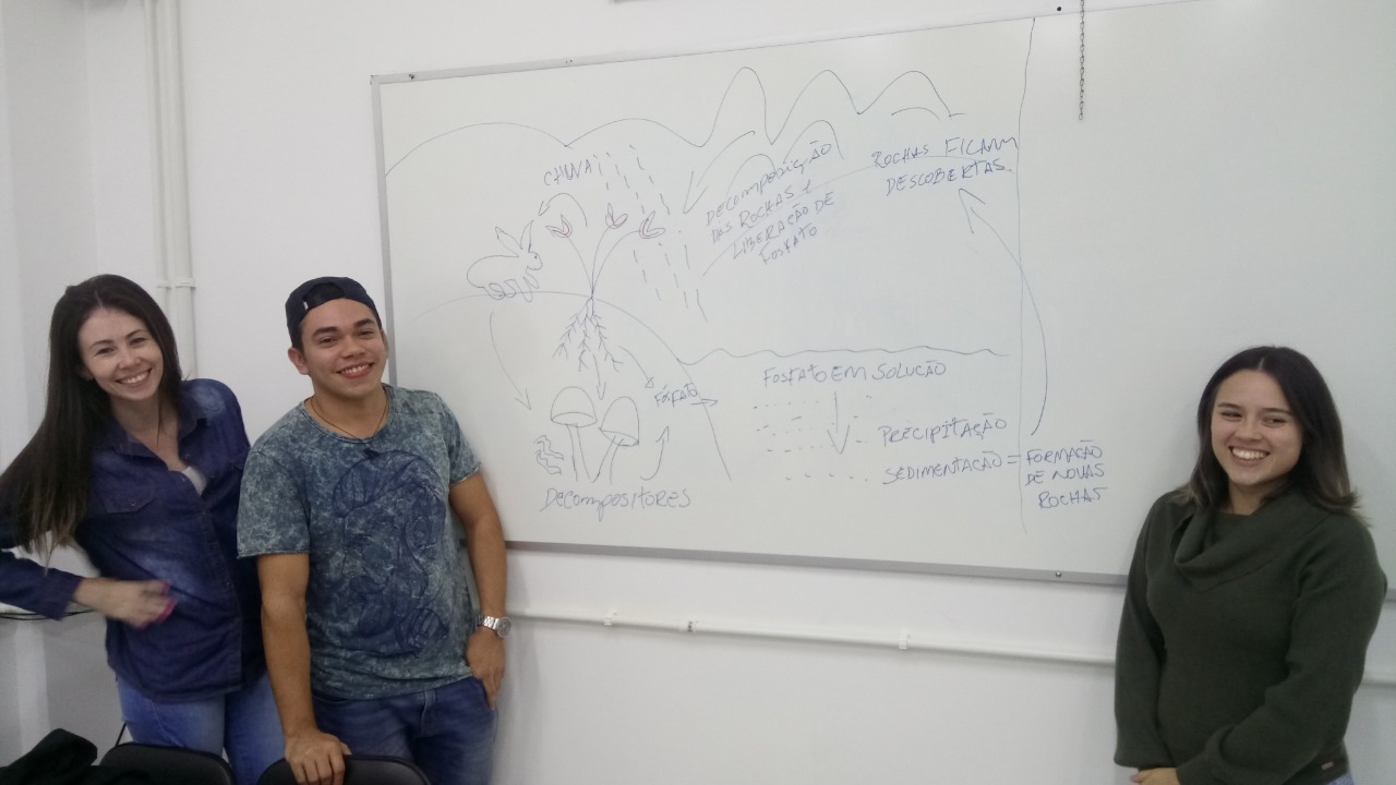 Os acadêmicos foram divididos em 4 (quatro) equipes de estudo, cada uma com um tema a ser trabalhado: ciclos biogeoquímicos do nitrogênio, do enxofre, do fósforo e do carbono. O trabalho desenvolveu-se através do estudo dos ciclos por cada equipe. Após 30 (trinta) minutos de estudo, as equipes realizaram a socialização de suas percepções em sala de aula.