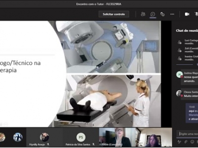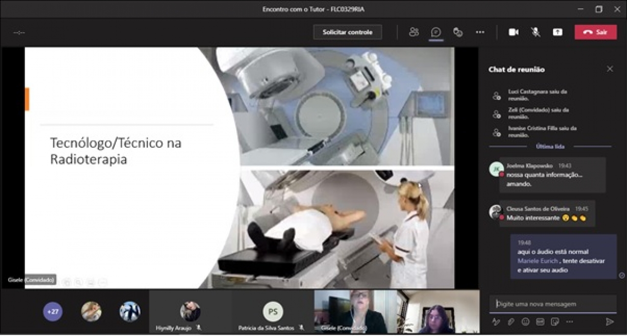 As profissionais convidadas pela tutora externa Evelyn Rosa de Oliveira foram Gisele Leal Prats, que discorreu sobre o tema “Pesquisa e Atuação do Tecnólogo em Radiologia na Radioterapia” e Flavia Marinoni, que discorreu sobre a “Pesquisa e Atuação do Tecnólogo em Radiologia na Tomografia Computadorizada”, ambas temáticas técnicas e fundamentais para o contexto profissional da radiologia.