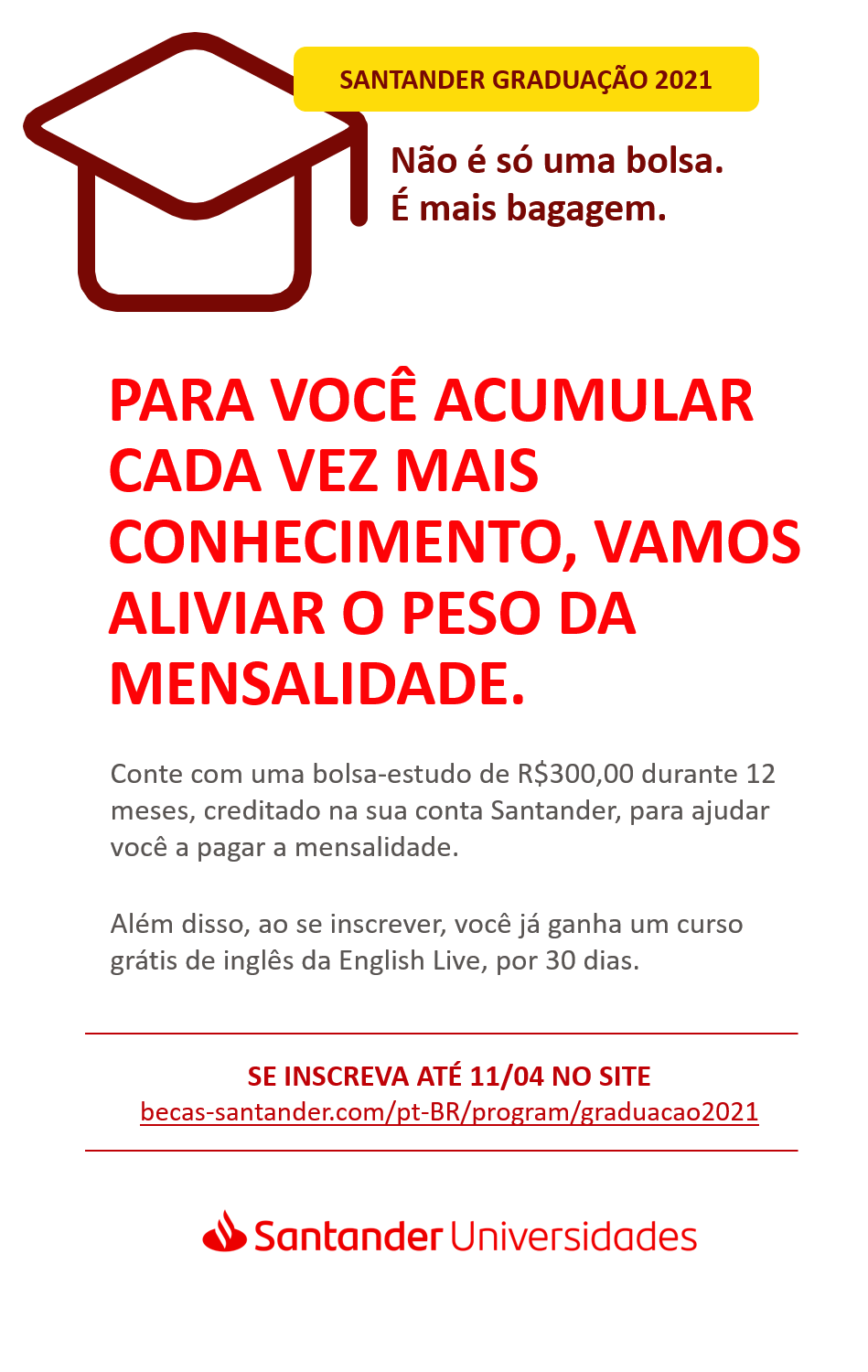 Mais uma vez, a UNIASSELVI participa do Programa Santander Graduação que tem como objetivo, oferecer apoio financeiro aos universitários, contribuindo no pagamento da mensalidade e/ou custos relacionados a sua formação.