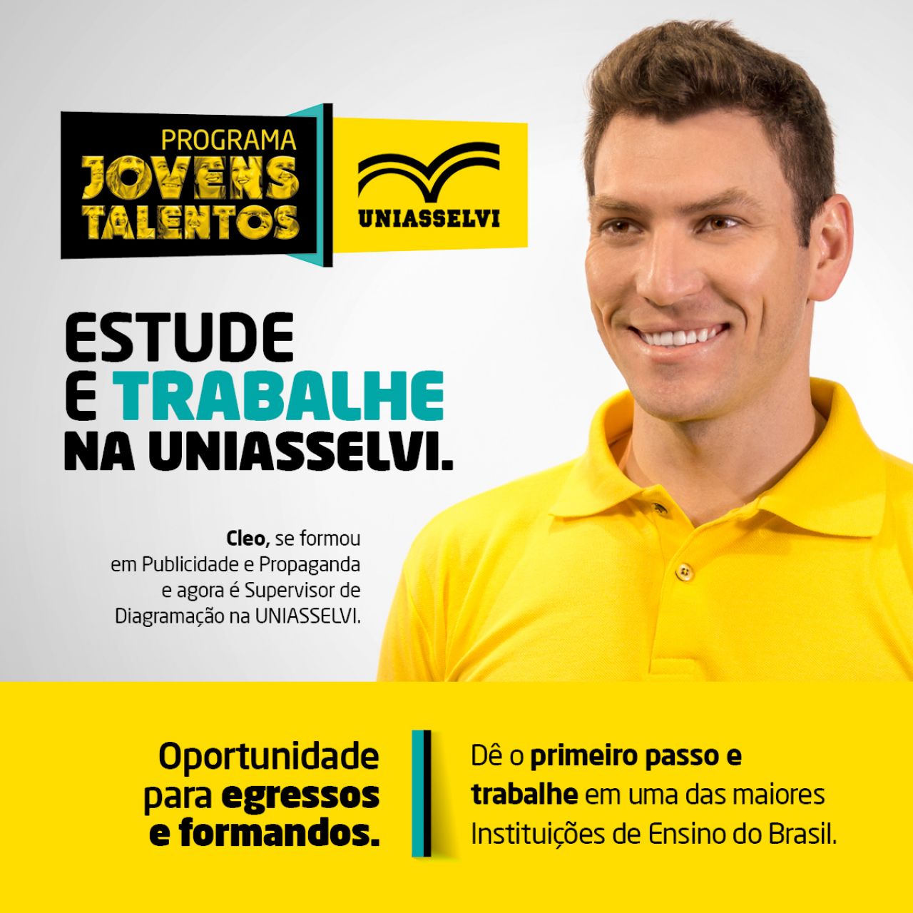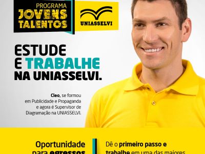 Para promover a qualificação e desenvolver o crescimento profissional dos acadêmicos e egressos, a UNIASSELVI lançou o Programa Jovens Talentos. A iniciativa é exclusiva para formandos e recém-formados da instituição. O intuito é selecionar jovens profissionais, com base no desempenho que tiveram durante o curso de graduação, para atuarem em áreas estratégicas da UNIASSELVI. As inscrições para o programa estão abertas até 4 de agosto e devem ser feitas pelo site portal.uniasselvi.com.br/institucional/trabalhe-conosco. Nesta primeira etapa do programa, as vagas serão destinadas para atuação na unidade corporativa de Indaial.