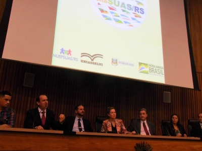 A mesa de abertura foi composta por diversas autoridades, incluindo o representante do Ministro da Cidadania, o Vice-Governador do Estado do Rio Grande do Sul, a Secretária do Trabalho e Assistência Social, o Presidente do Conselho Estadual de Assistência Social e o Reitor do Centro Universitário Leonardo Da Vinci – UNIASSELVI.