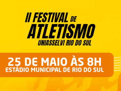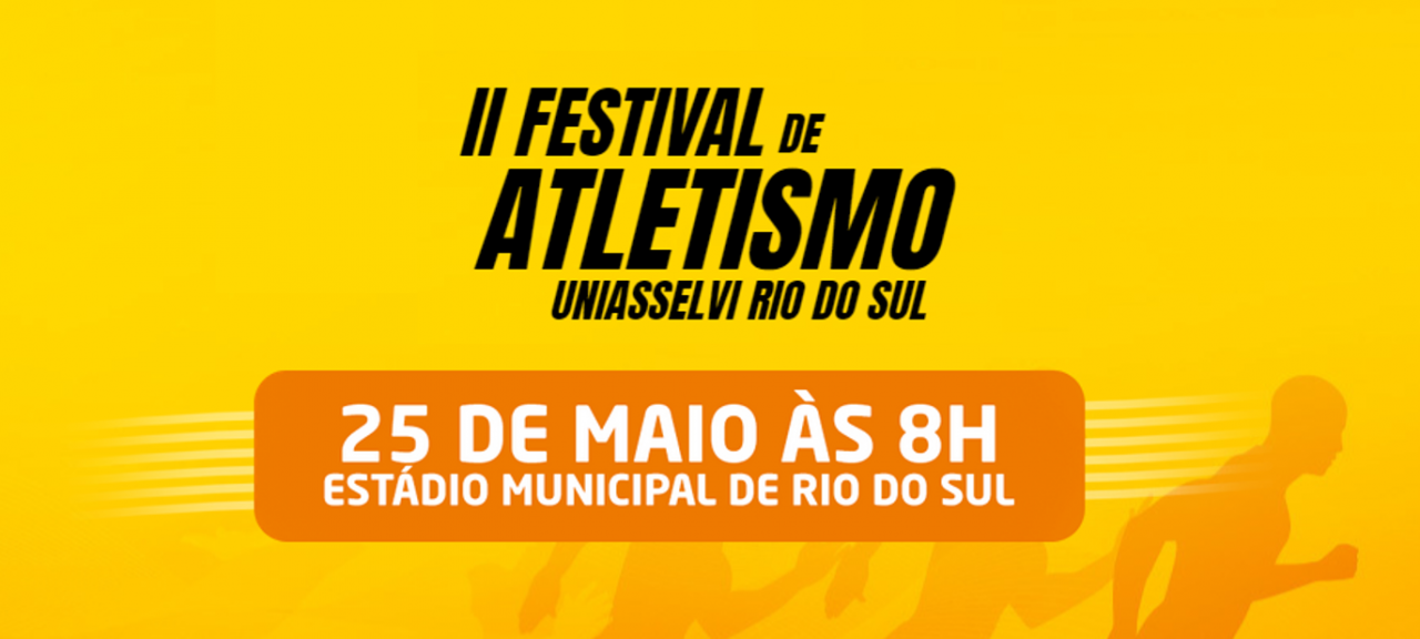2º Festival de Atletismo da UNIASSELVI Rio do Sul/SC – Dia 25 de maio, no Estádio Municipal de Rio do Sul, a partir das 8h. Destinado a estudantes de Ensino Fundamental e Médio. Inscrições gratuitas em vempra.uniasselvi.com.br/festivaldeatletismo.