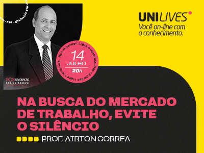 A segunda edição do UNILIVES acontece quarta-feira (14), às 20h por meio do Youtube. O tema apresentado pelo Professor Airton Correa, será Na busca do mercado de trabalho, evite o silêncio. O projeto foi desenvolvido pela Pós-graduação da UNIASSELVI e consiste em uma série de lives quinzenais para proporcionar mais suporte pedagógico e consequentemente mais qualificação profissional aos alunos da educação continuada.