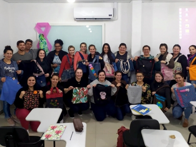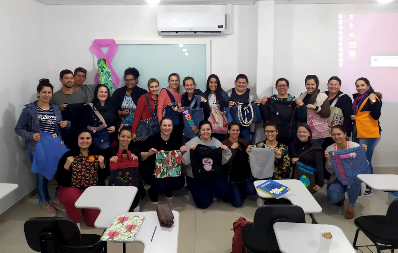 Acadêmicos do curso de Licenciatura em Pedagogia da UNIASSELVI Polo Torres/RS realizaram uma oficina de criação de sacolas reutilizáveis, promovida pela tutora da turma, Josiane Delfino, com o intuito de despertar o interesse dos alunos na adoção de hábitos menos prejudiciais ao meio ambiente, que não agridam tanto o planeta.
