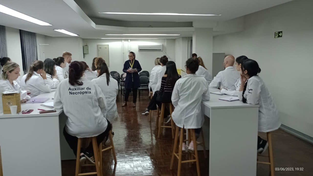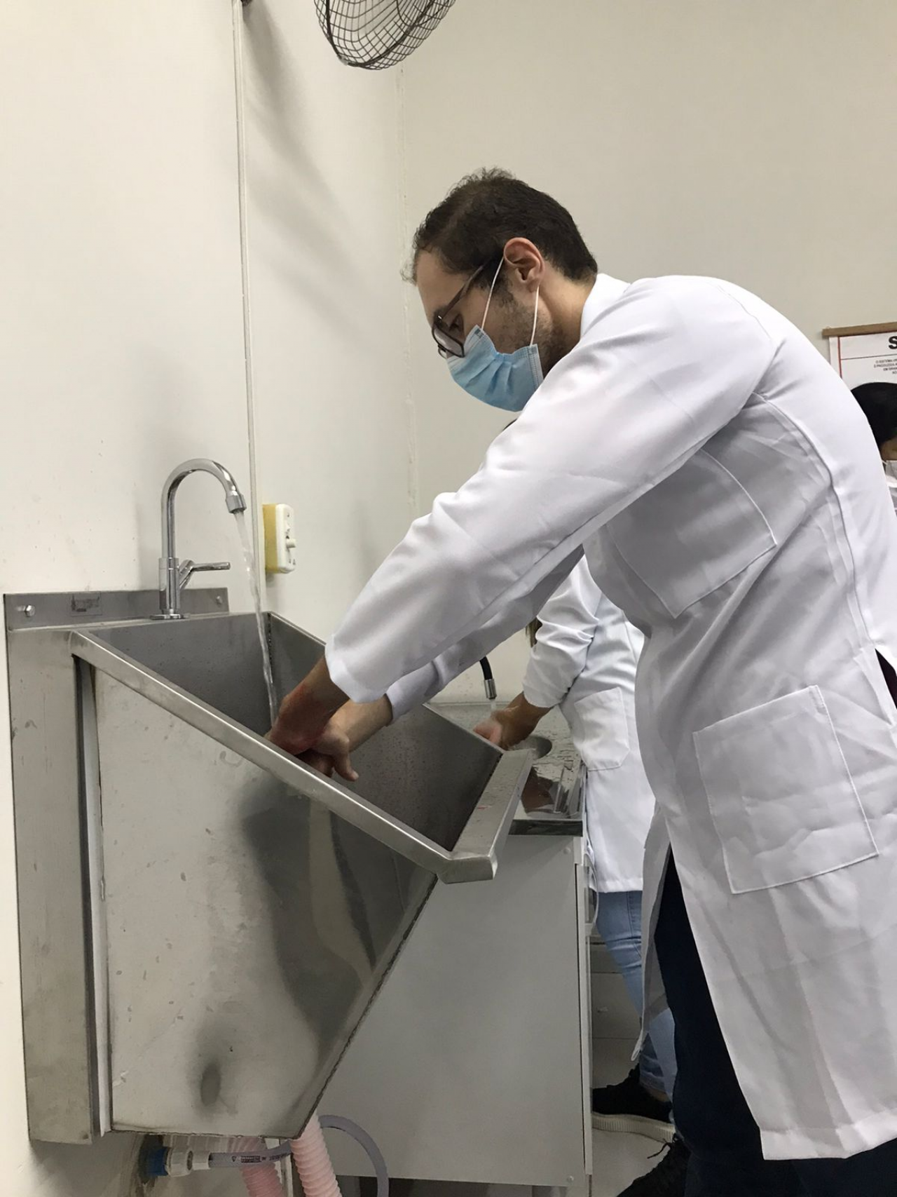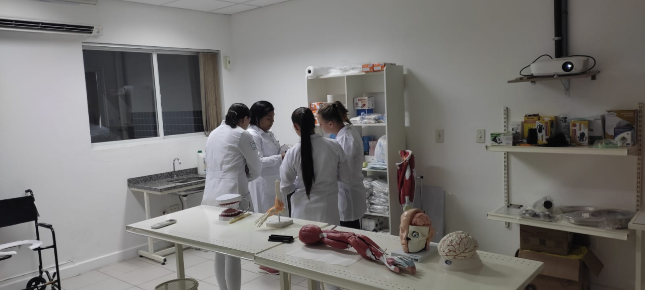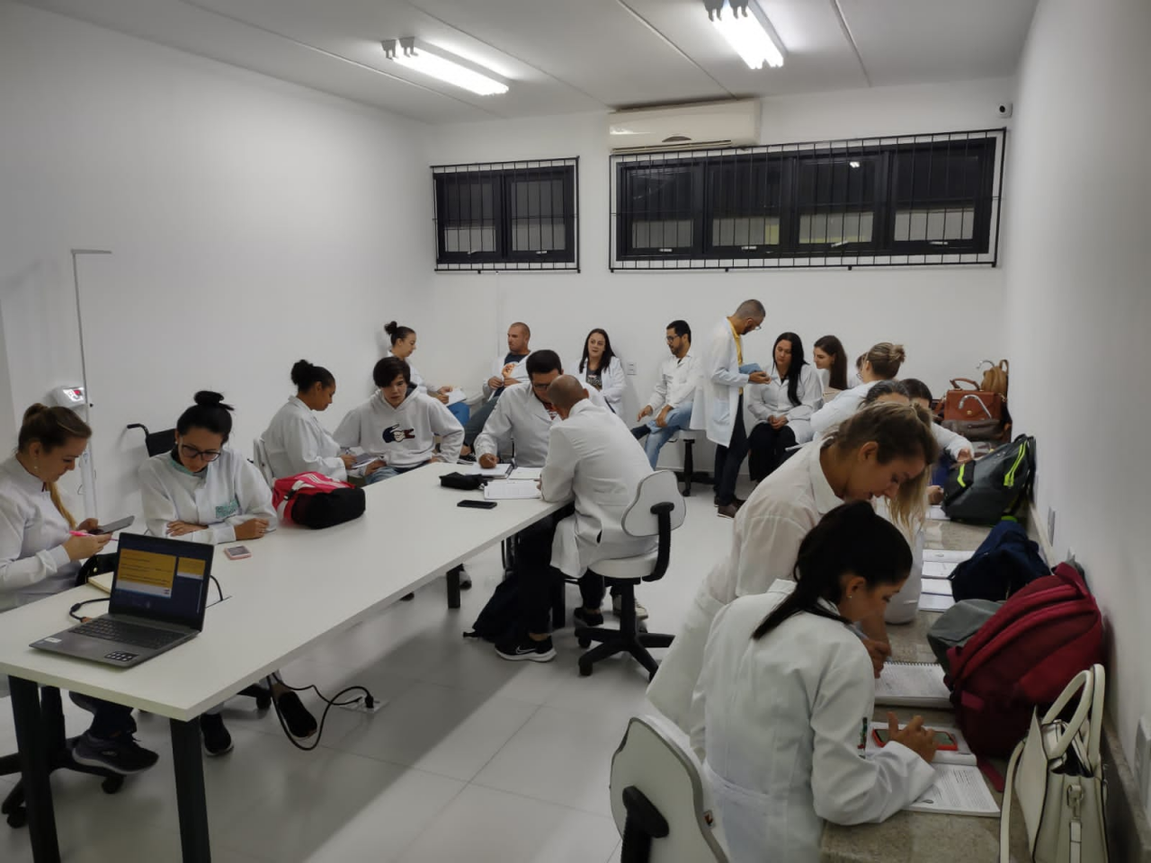 Usando jalecos brancos, os acadêmicos começaram a aprender a realizar procedimentos como por exemplo, higienização, exame de glicemia (cálculo da taxa de glicose no sangue), aferição pressão arterial e simulação de diferentes situações que necessitam de atendimento.